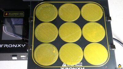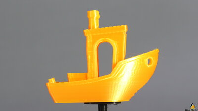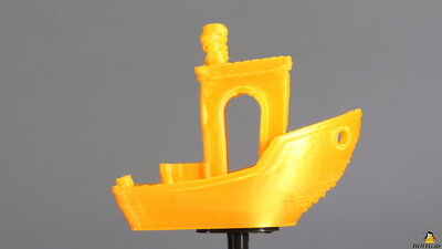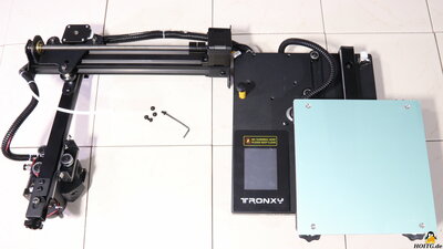 Package contentsFigure 2:The package includes the tools for assembling the components, replacing the 0.4mm nozzle and adjusting the mechanics. The short assembly instructions is included in printed form and are also located on the micro SD card that ships with the printer. AssemblyFigure 3:The CRUX1 is delivered almost fully assembled. Only the frame has to be mounted on the base, the handle as well as the filament holder and the glass plate have to be attached. MechanicsFigure 4:The CRUX1 has a direct extruder with the components not being hidden under a cover - everything is clearly visible. The Teflon tube runs to the filament sensor at the end of the X-axis and ensures that the plastic wire is fed in smoothly. The X-axis is guided by steel rollers with ball bearings along a steel bar, which in turn is attached to 20x20mm extruded aluminum. The print bed moves along the Y-axis following the same design principle. The Z-axis is guided by plastic rollers with ball bearings, the extruded aluminum here has the dimensions 20x40mm. The backlash of the plastic rollers can be minimized by turning an eccentric nut. The belt tension of the X-axis can be easily adjusted using a small hand wheel. The Y-axis belt tension is adjusted by moving the stepper motor, which is mounted on slotted holes. ElectronicsFigure 5:Inside the base, the electronic components are densely packed, but the arrangement looks tidy. The power supply provides an output voltage of 24V at up to 10A, corresponding to 240W. A microcontroller type STM32, on which the firmware "Marlin" runs, is placed on the mainboard. The modified Marlin source code was sent to me immediately upon request by email - that's totally in the spirit of "How Open Is This Gadget?". The drivers for the 4 stepper motors are soldered to the circuit board. Mechanical end switches are mounted on all three axes Test printsThe G-Code and stl files of all test prints done with the Tronxy CRUX 1 are available as download package (11.2MB).Figure 6: The first print job is to check the flatness of the build plate: 9 discs are printed, each with a diameter of 50mm and a height of 0.2mm. All details on the test procedure. Figure 7: 3D Benchy with optimal settings All details on the test procedure. Bei den folgenden Schnelldrucken der Benchy kommt es mit zunehmender Geschwindigkeit weniger darauf an zu sehen, was schlecht ist, sondern vielmehr, was noch gut gedruckt wird. Details hierzu gibt's in dem Kapitel zum Testverfahren. Figure 8: 3D Benchy with 60mm/s All details on the test procedure. Figure 9: 3D Benchy with 90mm/s All details on the test procedure. Figure 10: 3D Benchy with 120mm/s Print time: 32 minutes All details on the test procedure. Figure 11: In order to print large objects quickly, as much plastic as possible must be extruded per unit of time, which is tested here. Although the CRUX1 has a direct extruder, it comes with a stepper motor with no too high torque and the nozzle is a standard version. Therefore, the material throughput is obviously not the CRUX1's prime discipline, which is not quite as relevant for a printer with a small print volume. Layer height: 0.4mm Extrusion width: 0.7mm A, F, K = 30mm/s B, G, L = 60mm/s C, H, M = 70mm/s D, I, N = 80mm/s E, J, O = 90mm/s All details on the test procedure. Figure 12: Large 3D Benchy with optimal speed settings Benchy enlarged to 330% (192x102x158mm) Print time: 7.5 Stunden All details on the test procedure. My conclusionThe Tronxy CRUX 1 is a very compact printer. To my mind, smaller is better, especially for beginners, and since most prints aren't really large, a small, second machine is often a helpful tool for a quick project. The machine is sturdy and all components are easily accessible. Leveling of the print bed is done in the classic way by using a sheet of paper to adjust the gap between build plate and nozzle. Since the print head can be moved to the corner points quickly via the printer menu and due to the large handwheels, this can be done more quickly than with many printers that have an autolevel function.As far as I know, Tronxy does not claim any patents on the CRUX 1 and the modified source code of the "Marlin" firmware was sent to me immediately upon request. A good 3D printer that has everything you need for printing and no unnecessary frills.