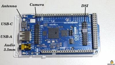 Package contentsFigure 2:The package contains only the GIGA Board and a plastic bracket that prevents short circuits from occurring when the board is placed on a conductive surface (metal plate). InterfacesFigure 3:With Bluetooth and WLAN, the GIGA R1 WiFi has two wireless interfaces. An external antenna can be connected via the connector on the circuit board. Without this, the range of the two interfaces is very limited. Up to 76 GPIOs are available. Some of these can be used on the hardware side for specific functions. Pin 54 - 67 can be used as a camera interface. The pin header on D1N and D1P can be used as a display port. The board is programmed and supplied with power via the USB-C interface. Peripherals such as memory sticks or USB keyboards can be controlled via the USB-A interface. The 3.5mm audio interface has two 12-bit digital-to-analog converters for outputting sounds. This can also be switched as an input for e.g. microphones. A CAN bus is available via the pin headers. My conclusionThe Arduino GIGA is an intermediate step from the classic microcontroller to a fully-fledged PC. The advantage of the GIGA lies in the fact that the architecture and thus the software required for operation remain reasonably manageable.As an advocate of the "less is more" philosophy, the GIGA R1 WiFi is actually total "overkill", because for many really great projects you only need an Arduino UNO. Nevertheless, when it comes to machine control or data processing, more computing power is often simply unavoidable. The GIGA should fulfill pretty much all wishes in this regard. More questions?Don't ask me, ask Arduino, because they simply know more about the board: Arduino.cc