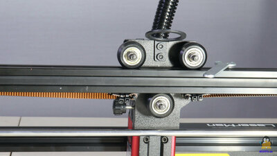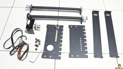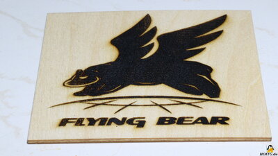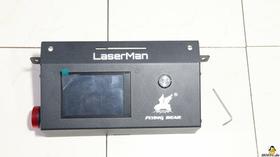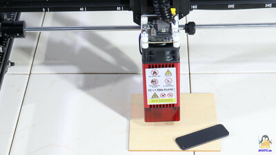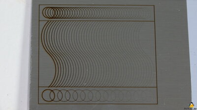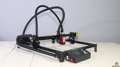 Package contentsFigure 2:Included in the package are a power supply that delivers 12V output voltage at up to 4A, a micro SD card and an USB cable for data transfer from a PC, tools for assembly, and some materials that can be processed with the device. A "lathe" with which round objects can be engraved is available as an extra. Also included are safety goggles, which must be worn when handling the device! AssemblyFigure 3:The frame has to be assembled and the preassembled traverse for the X-axis, has to be attached. When it comes to electronics, only a few cables need to be attached and plugged in. The assembly instructions in English are clearly written and contain many self-explanatory illustrations. MechanicsFigure 4:The axles are guided by plastic rollers with ball-bearings along the 20x20mm extruded aluminum bars. Backlash in this mechanism can be eliminated with the help of an eccentric nut. The axes are driven via timing belts - the X-axis motor is on the right side of the traverse. By moving this stepper motor, the X-axis belt can be tightened. Both sides of the Y-axis are driven by just one stepper motor - the pulleys of both sides are linked via a round rod. The advantage of this construction is that the two axes cannot get missaligned even while the machine is switched off. The toothed belts of the Y-axis are fixed with screws at the ends of the aluminum bars and the correct tension is simple to adjust. One limit switch for the X- and one for Y axis are available. The laser head moves to the lower left corner when homing is triggered. The working area is 40x45cm. If everything is properly adjusted, the mechanics runs smooth with almost no backlash. ElectronicsFigure 5:The plugs on the mainboard are locked in place with glue and the wiring looks quite tidy. The colored touch screen is on a makerbase board. An infrared diode serves as a flame sensor, with which the LaserMan is cut off from power as soon as a given threshold is exceeded. The sensitivity of the sensor can be adjusted by a potentiometer. The two stepper motor drivers are soldered to the main board. The processor is type ESP32 with WLAN support. LasermoduleFigure 6:The laser module included in the package works with a wavelength of 445nm. The output laser power is given as about 5.5W. The laser is focused by adjusting the height so that the 2mm metal spacer plate just fits between the surface of the workpiece and the lower edge of the protective cover. ExtrasFigure 7:A "lathe" is available as an accessory, which can be used to engrave round objects. In order to be able to bring the laser to the required height, I raised the feet with four bricks - I know that this can certainly be solved more elegantly. The stepper motor attached to this "lathe" is connected to the electronics instead of the Y-axis motor, which must be done with the machine switched off. TestsFigure 8:The cutting performance is tested on a stack of 2mm cardboard with the speed set to 60mm/min. As to be expected with a 5.5W laser module, two layers are cut cleanly and the 3rd layer is only "engraved". Detail on the test procedure. Figure 9: Engraving is tested on stainless steel. You can see how finely engraved and what depth can be achieved. The speed is gradually increased from left to right. Detail on the test procedure. Figure 10: More examples done with the LaserMan My conclusionThe FlyingBear Laserman has not shown any weaknesses during my tests. Operation via the color touchscreen is convenient and thanks to the integration of WLAN and a card reader, operation is also possible without a directly connected PC. The air filter is not a bad approach, but it cannot prevent harmful gases from being emitted into the surrounding air.Thanks to the open source firmware based on grbl, the necessary machine data for the LaserMan can be generated by common programs.