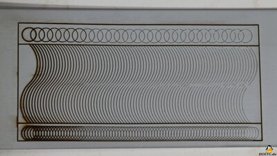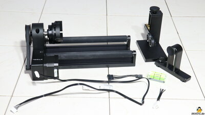 Package contentsFigure 2:Included in the package are a power supply that delivers 25V output voltage at up to 6A, a micro SD card and a USB cable for data transfer from a PC, tools for assembly, and some materials that can be processed with the device. A "lathe" with which round objects can be engraved is available as an extra. Also included are safety goggles, which must be worn when handling the device! AssemblyFigure 3:Only 16 screws need to be tightened to assemble the frame and the cables have to be plugged in and secured with zip ties - everything is done very quickly and you really can't do anything wrong. MechanicsFigure 4:The axes are guided by ball-bearing steel rollers along round steel rods. The mechanism on the two sides of the Y-axis shows no noticeable backlash, nothing wobbles or bends here. The guide along the X-axis, to which the laser head is attached, has a spring-loaded suspension of the lower, third steel roller. This means that the laser head can be moved relatively easily by hand, but during operation the spring tension is sufficient to hold the laser in place. Both sides of the Y-axis are driven by just one stepper motor - the pulley on the second side is connected to the motor shaft by a round rod. With this system, the axes remain at right angles, even when the machine is switched off. The timing belts are tensioned very conveniently at the ends with the deflection rollers. Just one screw needs to be loosened, the desired tension has to be set with a second screw and finally the first screw has to be retightened - this system is used for all three timing belts. ElectronicsFigure 5:There are limit switches at both ends of both axes - a total of 4 optical switches prevents the laser head from being moved to positions outside the maximum working range. The mainboard is placed well protected at the front of the frame. The on-off switch, as well as the sockets for the power supply and the USB interface are soldered directly onto the circuit board. A push button is actuated via a brass button at the top of the frame - this allows the machine to be stopped quickly should something go wrong with a job. A fairly loud piezo buzzer is used to output acoustic signals. The two drivers for the stepper motors are located under a rubber block that serves as a stop for the circuit board on the frame. Gcode files can be processed directly by the machine via a micro SD card reader. An ESP32 with integrated WLAN is used as microcontroller. Laser moduleFigure 6:The laser module with the label MD1 Pro-L20 has a maximum output power of 20W at a wavelength of 445nm. With a voltage of 24V at up to 3A, this corresponds to an electrical input power of 72W. The laser module is prepared for Air-Assist. A second laser diode, emitting a low-power red light beam, projects a crosshair onto the workpiece, making it very easy to position the laser head. The laser module is focused by adjusting the height above the workpiece so that the fold-out tool touches the surface. If thicker material is to be cut, the focus point can be placed under the material surface - the tool can be adjusted accordingly via a printed scale. ExtrasFigure 7:The lathe is driven by a separate stepper motor. This stepper motor is connected to the main circuit board instead of the Y-axis motor, which must be done while the machine is switched off, otherwise the stepper motor driver could be damaged. The lathe comes with many adapters so that nearly any cylindrical surface can be engraved. TestsFigure 8:The cutting performance is tested on a stack of 2mm cardboard. 2 layers of cardboard are cut through in one pass at a cutting speed of 240mm per minute. Details on the test procedure. Figure 9: Engraving is tested on stainless steel. You can see how finely engraved and what depth can be achieved. The speed is gradually increased from left to right. Details on the test procedure. Figure 10: More examples done with the LaserMan My conclusionMechanics and electronics of the D1 Pro did not show any weaknesses in operation. Unfortunately, the firmware is closed source, which also applies to the associated PC software, for which there is also no Linux version available. The only option left is to transfer data via a micro SD card. The file to be processed must be saved on the SD card under the name "tmp.gcode", then pressing the "Start" button is sufficient. to process the file.