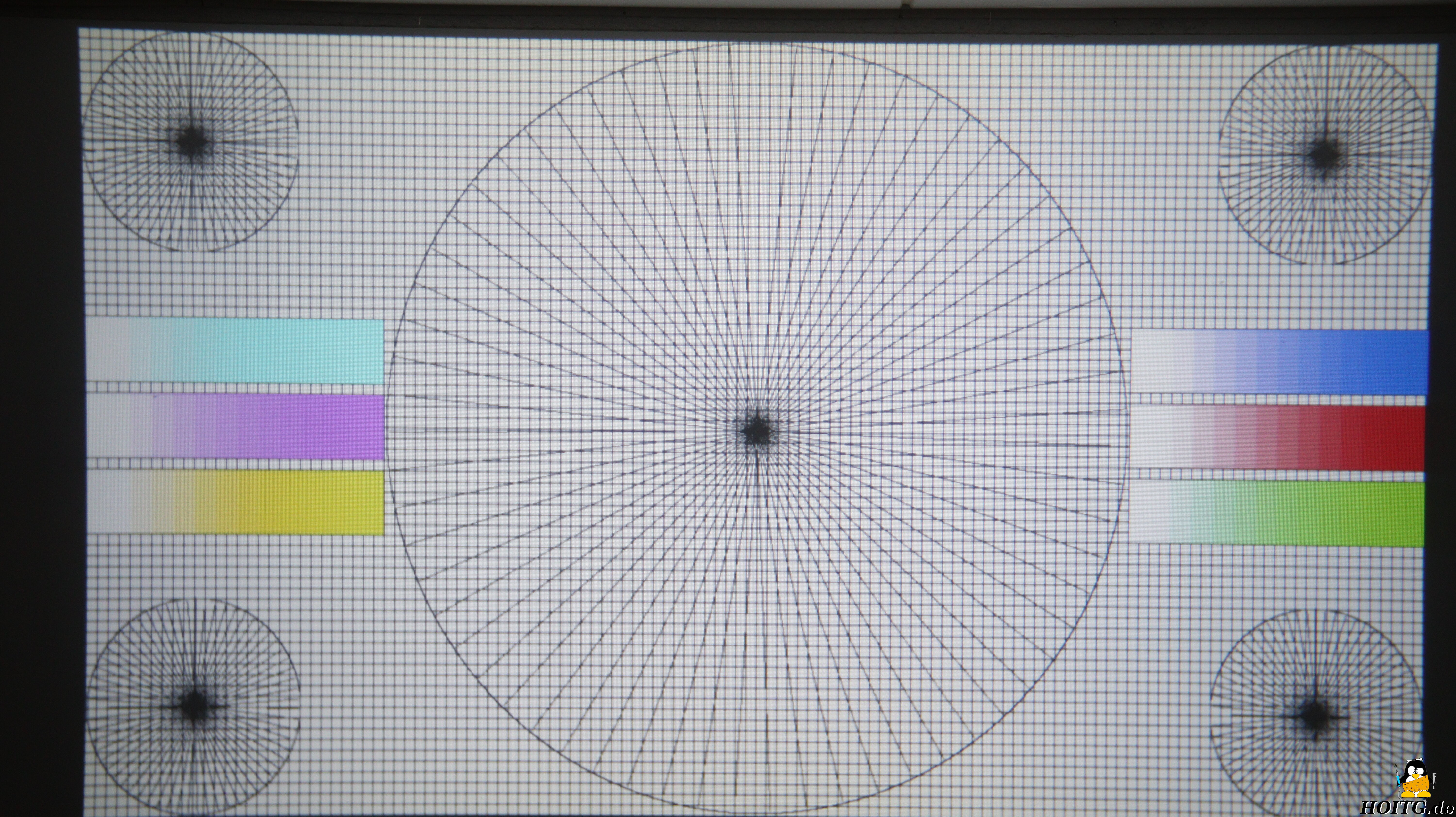 For the projection of the test pattern, the projector is aligned as perpendicularly as possible to the center of the screen and with the projection alignment of the firmware is set to 0. Since my camera inevitably has to be set up next to the projection line, the projection is not a perfect rectangle.