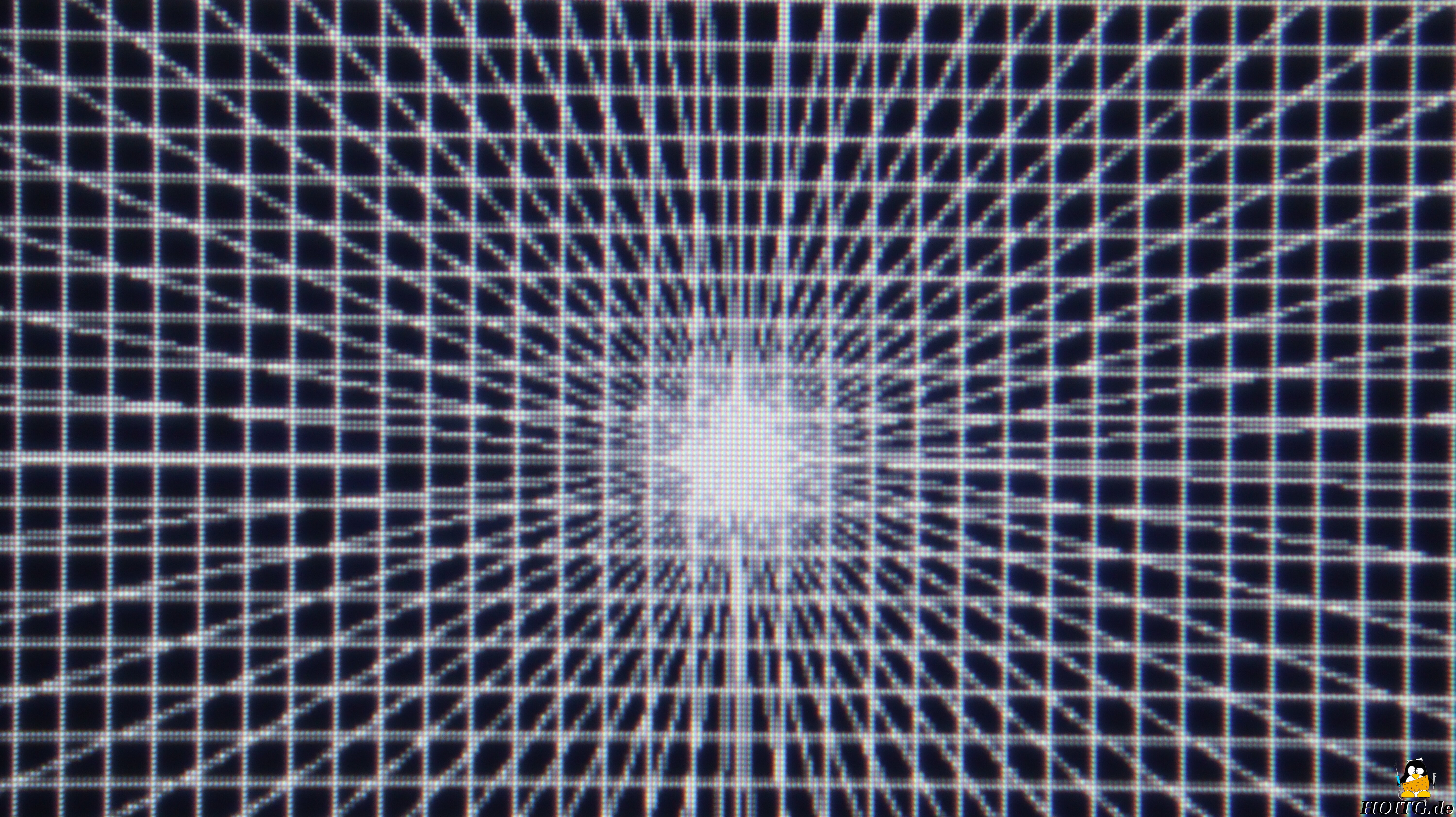 Ideally, the projection surface should be illuminated evenly in all colors. I use a white, red, green and blue test projection. Test patternThe test pattern shows several weak points:The grid lines should be parallel. The lines should not be broken anywhere. The lines should be as sharp as possible across the entire image. If possible, no colored fringes should be visible on the grid lines. This is particularly noticeable with black grid lines on a white background. Such "chromatic aberrations" can usually be seen on lines on the outer edges. Fuzzy edges with color fringes are the most noticeable error of the projector lenses. The cheaper the device, the more obwious the colored edges, or to put it another way: the sharper the edges, the better the optics. The higher the physical resolution and the better the optics, the easier it is to identify lines that are close together as individual lines. This can be seen with the five "stars" in the test pattern.