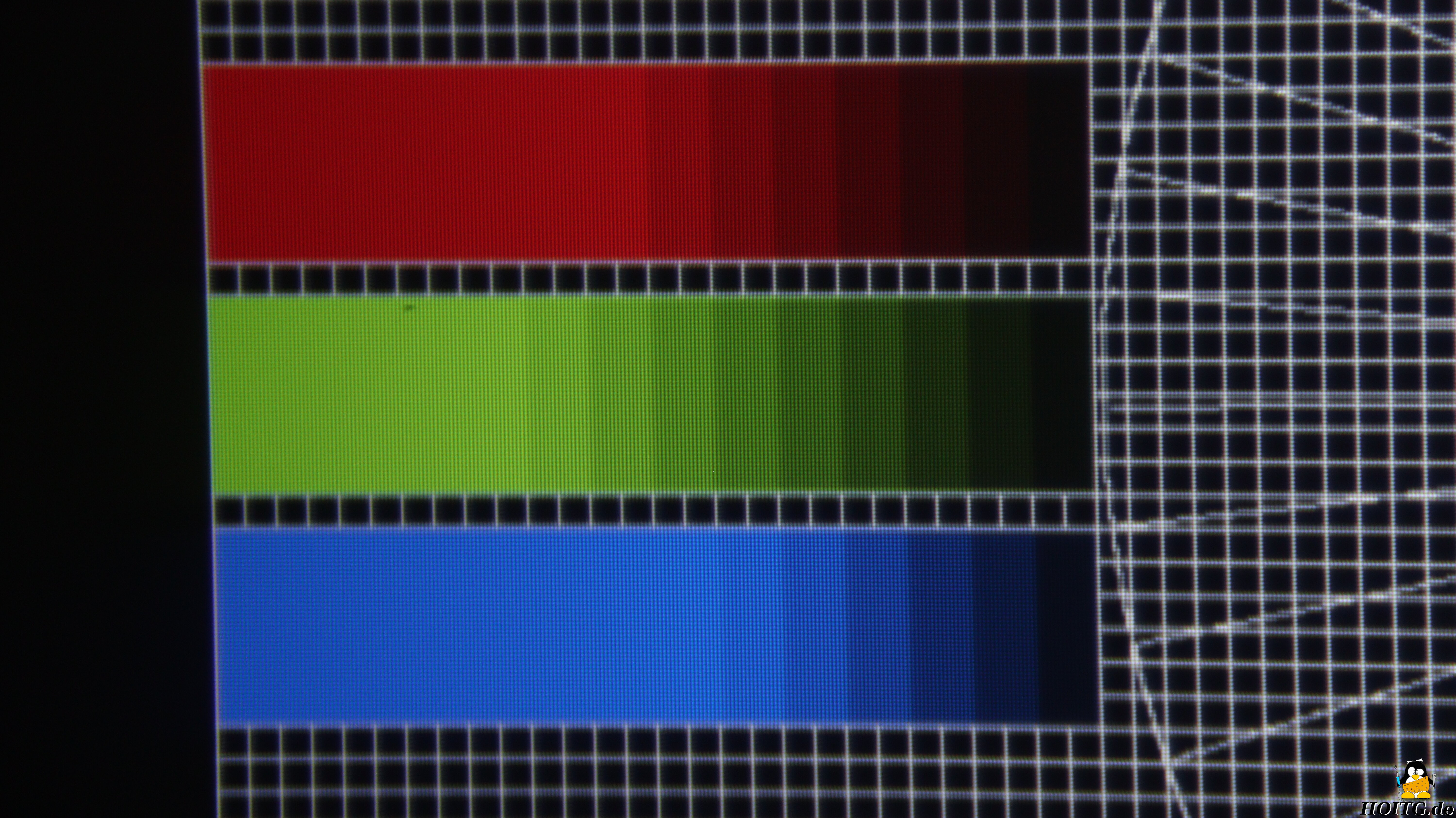 Photographing the colored projection with a camera and then displaying it on a screen literally calls for falsifications. Nevertheless, I inserted rectangles with the colors red, green, blue, cyan, magenta and yellow in the test pattern. Each color is shown in 14 shades. the more nuances you can spot, the better.